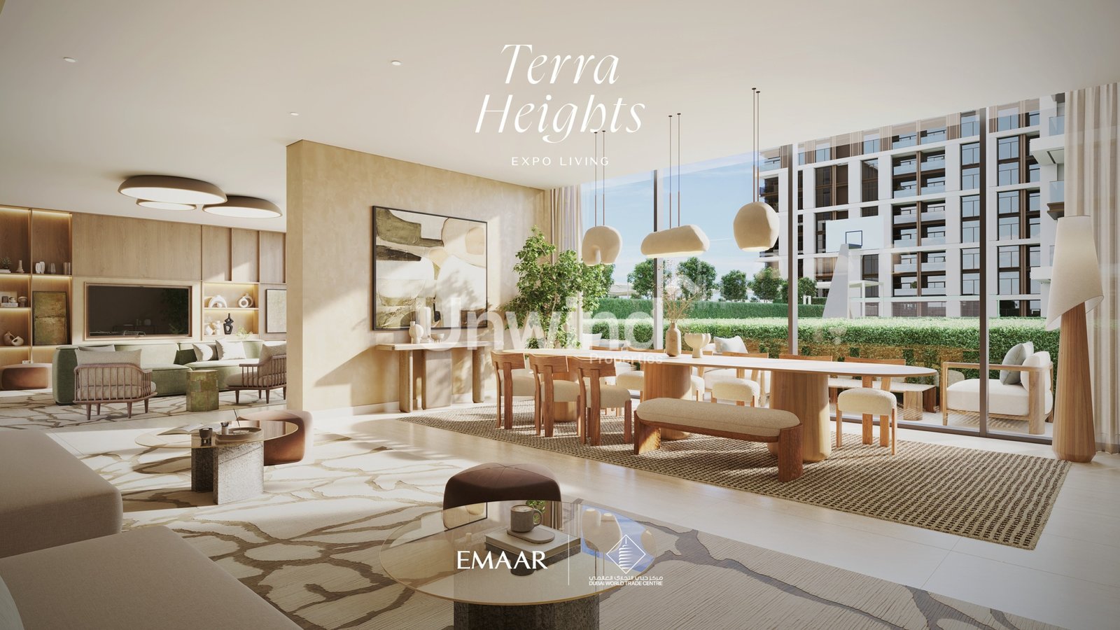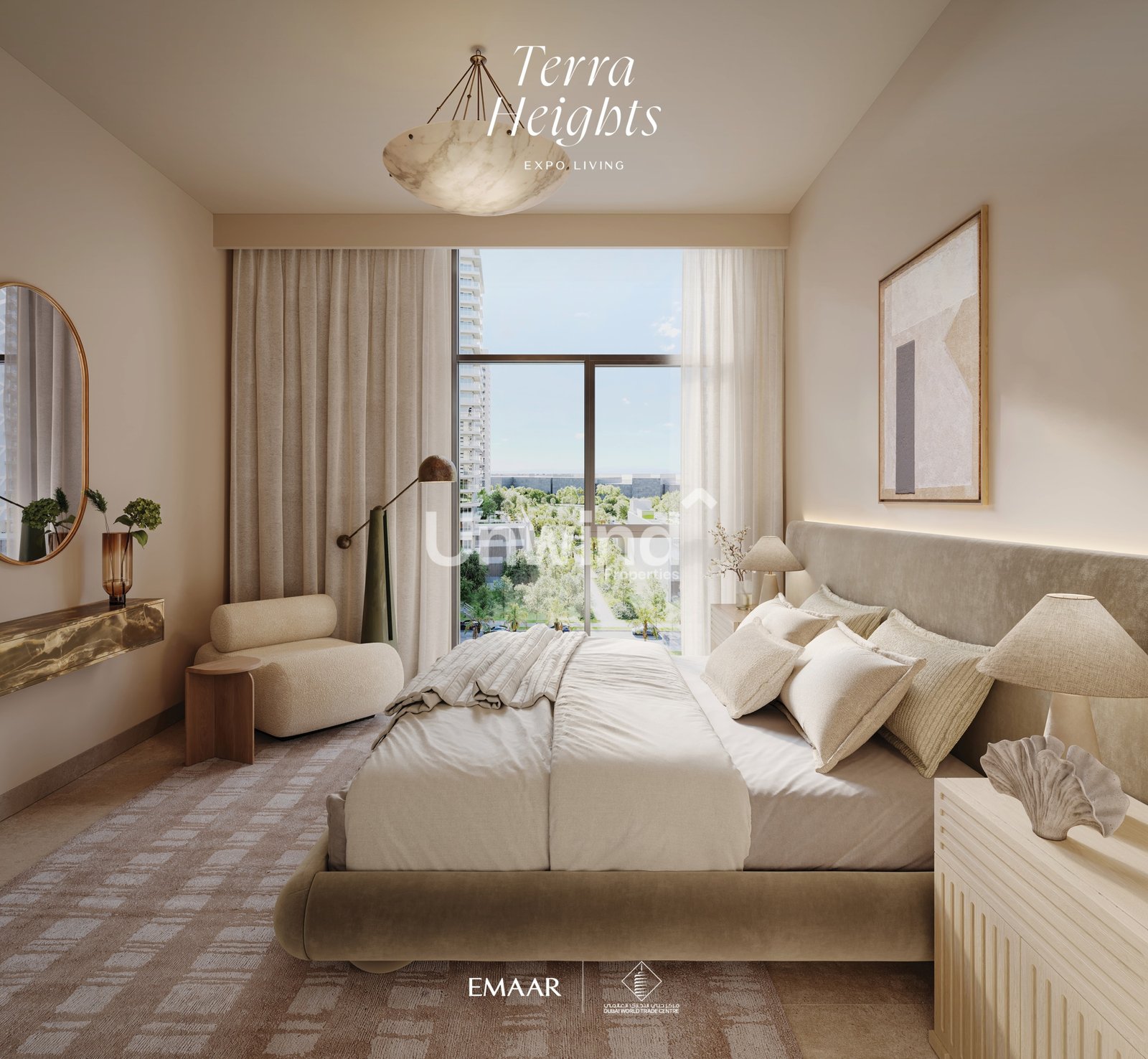 Sophisticated Design: Floor-to-ceiling windows showcase serene green spaces and Expo City’s evolving skyline.